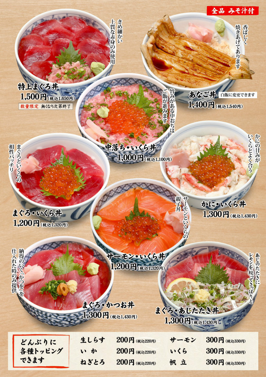 1号店はお寿司・海鮮丼がメインとなります。豊富な海鮮丼のメニューと